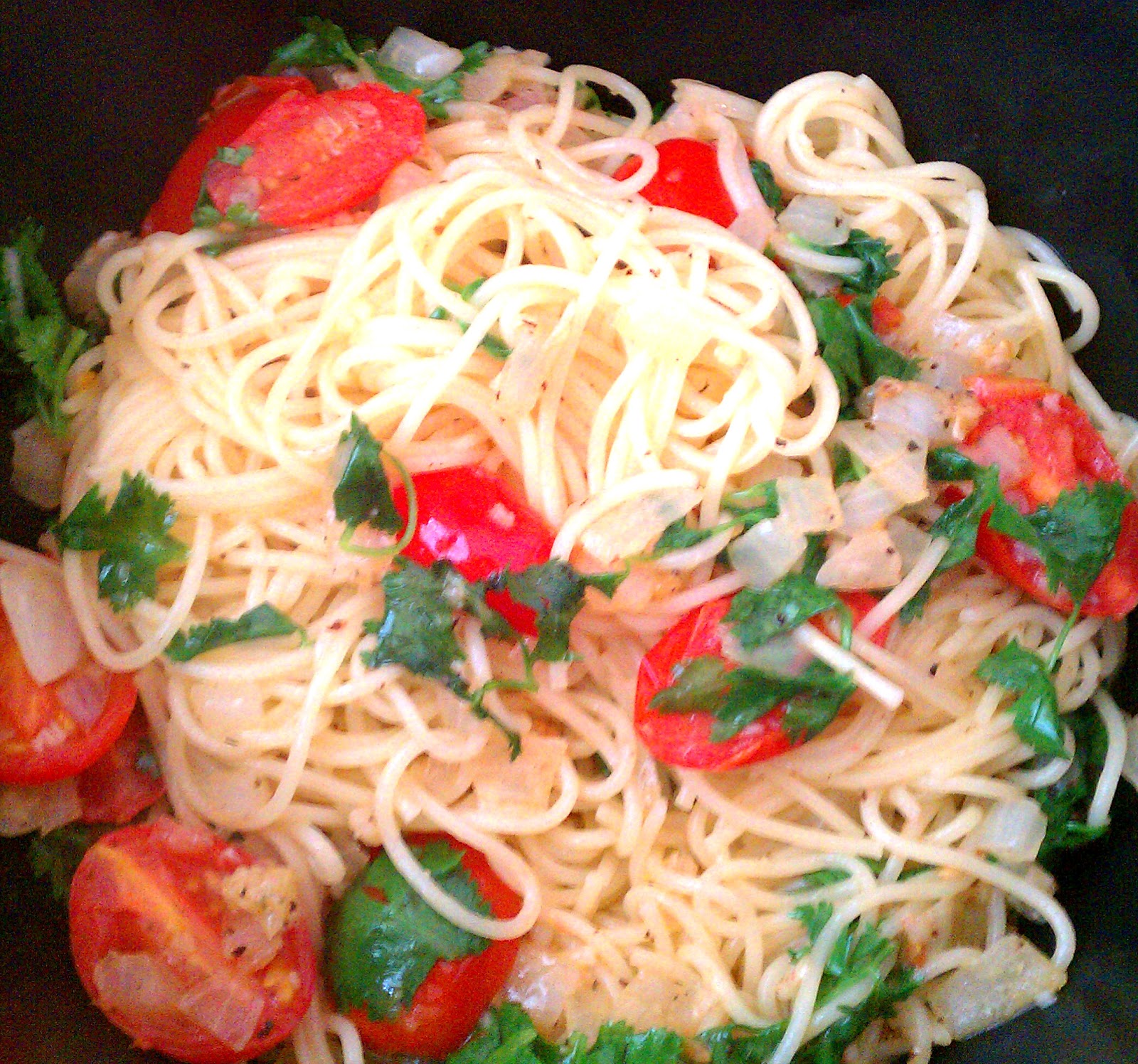 Cook pasta according to box. Sautee onion and garlic in olive oil. Add the halved grape tomatoes when the onions are almost done (translusent in color) so as not to over cook them. Add lime juice and additional olive oil, if needed, and let simmer on low for a few moments while you're draining your pasta. Toss pasta and cilantro in mixture and serve.
